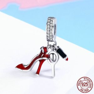 S925 Sterling Silver Red Lipstick High Heel Shoes Makeup Mirror Pendant